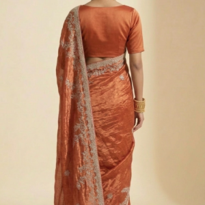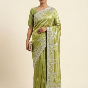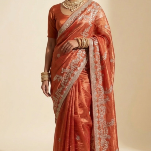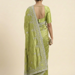 A poetic expression of grace, this teal blue silk saree embodies timeless elegance with a contemporary soul. Intricately adorned with delicate silver embroidery, it captures the quiet luxury of refined craftsmanship.